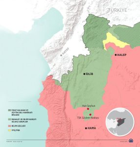Suriye’de, 2018 ortalarına gelindiğinde dört ayrı bölge göze çarpıyordu: Ülkenin yarısından çoğunu Rusya’nın desteklediği Suriye hükümeti; kuzeydoğusu ve doğusundaki bir bölümü ABD’nin desteklediği PYD; kuzeyini ise Türkiye’nin desteklediği Özgür Suriye Ordusu (ÖSO) kontrol ediyordu. Dördüncü bölgeyse, kuzeybatıda yer alan ve tek bir grubun denetiminde olmayan İdlib idi.