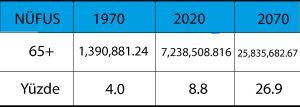 2018 yılında yaşlı nüfus oranı dünyada yüzde 9.1, Türkiye’de ise yüzde 8.8 oldu. Hâlâ dünya ortalamasının çok az altında olsak bile bu rakam bizi 167 ülke arasında en fazla yaşlı nüfusu sahip 66. ülke yapmaya yetti. (TÜİK, 2019). Üstelik biz, 8.8 oranına 2018’de değil, 2020’de ulaşacağımızı tahmin ediyorduk, yani beklediğimizden de hızlı yaşlanıyoruz.