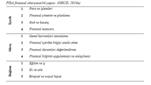 Ergenlik dönemindeki öğrencilerin yaşam becerilerini ölçen ve OECD tarafından yürütülen2 Uluslararası Öğrenci Değerlendirme Programı (PISA), sınavlarında finansal okuryazarlığa 2012 yılından bu yana yer veriyor. Bu sınavlarda, finansal okuryazarlık yapısı içerik, süreç, bağlam olmak üzere üç aşamada şekillendiriliyor.