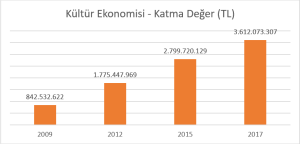 Kültür ekonomisi katma değer yaratma potansiyeli bakımından genel ekonomi ortalamasının çok üzerinde. Bir örnekle anlatmak gerekirse, kültürel sektörlerde üretilen toplam katma değerin elde edilen toplam gelir (ciro) içindeki payı 2017 yılında %25’di. Yani, kültür ekonomisinde üretilen her 100 birim cironun ortalama 25’i katma değerdi. Türkiye’deki tüm sanayi ve hizmet sektörlerinin aynı gösterge bakımında ortalaması ise sadece %15.