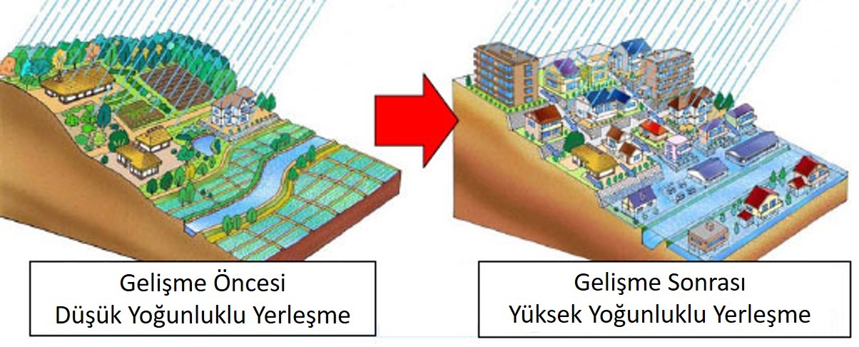 Ancak kentlerimizde özellikle yoğun bir biçimde kırdan kente göç ve nüfus artışı sonucu doğal drenaj alanlarının çoğu korunamadı. Hatta uzun yıllar akarsuların kent içinden geçen kısımlarının belli bir bölümünü kapalı kesit hale getirerek kentsel kullanımlara açan pek çok kentimiz bulunuyor. Örneğin, Ankara’da isimlerinden de anlaşılacağı üzere Kavaklıdere, Cevizlidere, Hoşdere vb. gibi caddelerimiz eskiden birer dere ve dere yatağı iken şimdilerde yollara, yerleşimlere dönüşerek birer yer altı kanalizasyonu haline geldi. Bu nedenle özellikle artan yağış rejimleri sonrası bu ve bunun gibi alanlarda su baskınlarına rastlıyoruz.