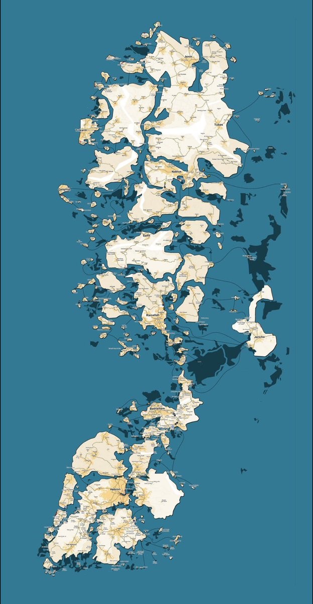 İngiltere merkezli Middle East Eye haber analiz internet sitesinin yayınladığı aşağıdaki harita, Trump’ın planına göre, toprak bütünlüğü olmayan Filistin’in aslında nasıl gözükeceğini ortaya koyuyor ve Batı Şeria’da İsrail’e bırakılan mavi bölgelerin ortasında kalmış Filistin topraklarının ne kadar birbirinden kopuk adalar haline getirildiğini anlatıyor.