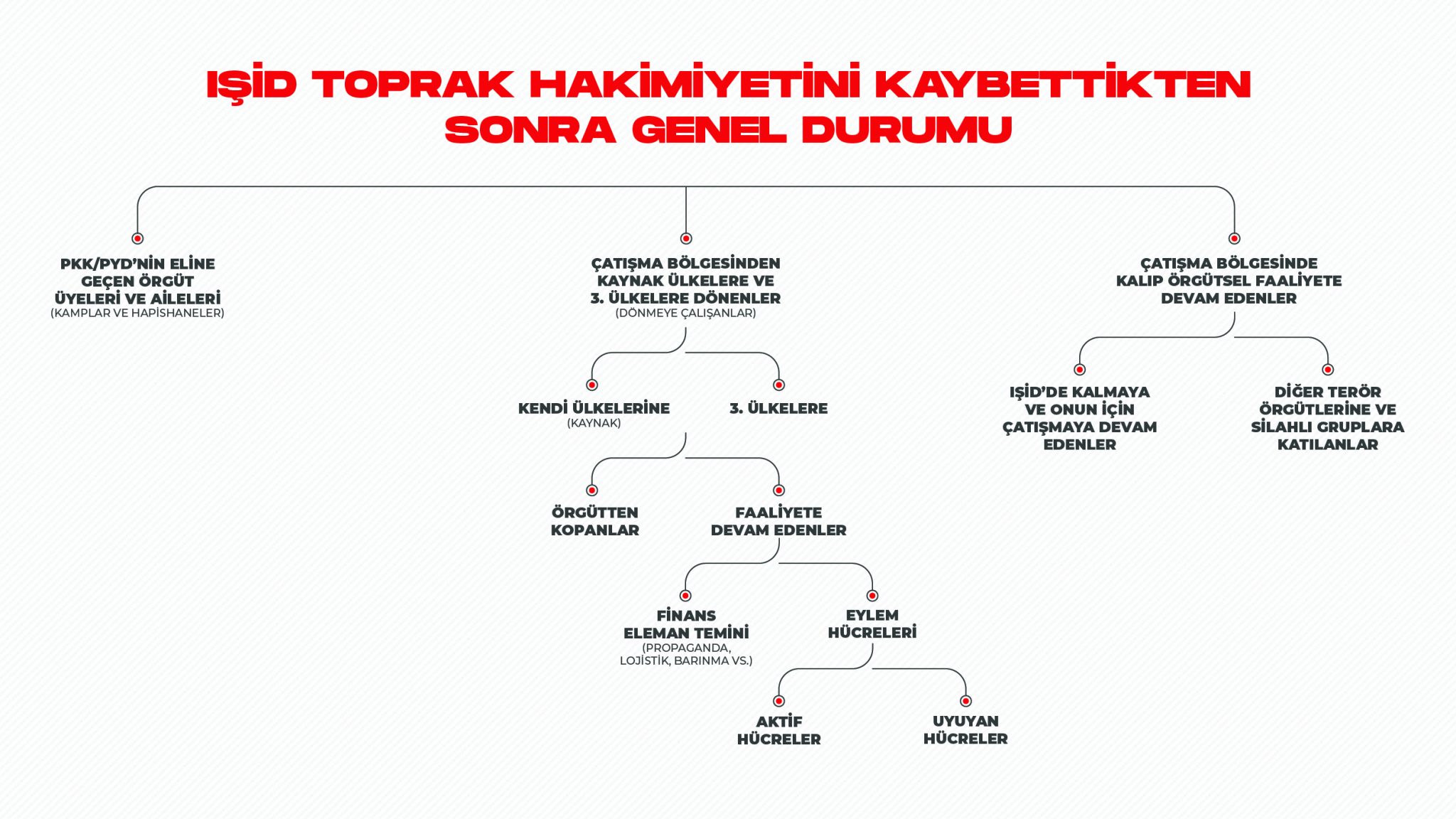 İkinci ana başlık ise örgütün dağılmasıyla ortaya çıkan sürecin Türkiye’ye yansıması çerçevesinde incelenmeli. Epey karmaşık ve uzun uzun anlatmak gerekiyor. Ben bunun yerine sizin için bir şema yaptım. Özetle örgütün toprak kontrolünü yitirmesiyle dağılan yapıdan bir kısmı da Türkiye’ye de geldi. Bunun içinde örgütten kopan ve hayatlarını kurtarmak için herkesten saklanan kişiler bulunuyor. Fakat sayıca çoğunluğu örgüt için faaliyete devam eden grup oluşturuyor. Bunlar arasında çok büyük bir kısmı finans ve eleman temini ile barınma başta olmak üzere lojistik destek sağlamaya çalışan gruplar.