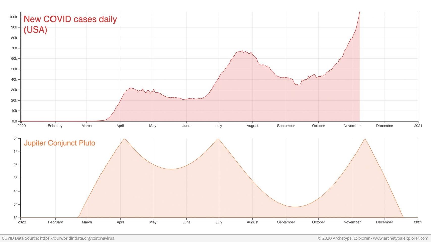 Meslektaşım Chris Brennan’ın hazırladığı grafik de ABD’deki COVID-19 zirveleri ile gezegen kavuşumlarının ve açılarının astrolojik öngörülerdeki etkisini ortaya koyuyor.