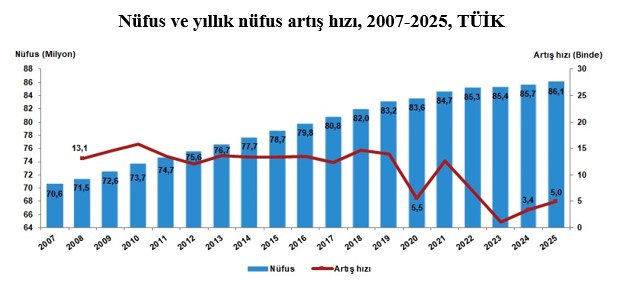 2025 yılı ADNKS sonuçlarına göre 31 Aralık 2025 itibarı ile Türkiye nüfusu 86 milyon 92 bin 168 kişiye ulaşarak 86 milyonu aştı. Bir önceki yıla göre Türkiye nüfusu 427 bin 224 kişi arttı. Aşağıdaki grafikten de görüleceği gibi 2000’li yıllardan 2022 yılına kadar Türkiye nüfusu her yıl yaklaşık 1 milyon artarken, 2022 yılında 85,3 milyon olan Türkiye nüfusu ancak 2025 yılı sonunda 86 milyonu aşabildi.