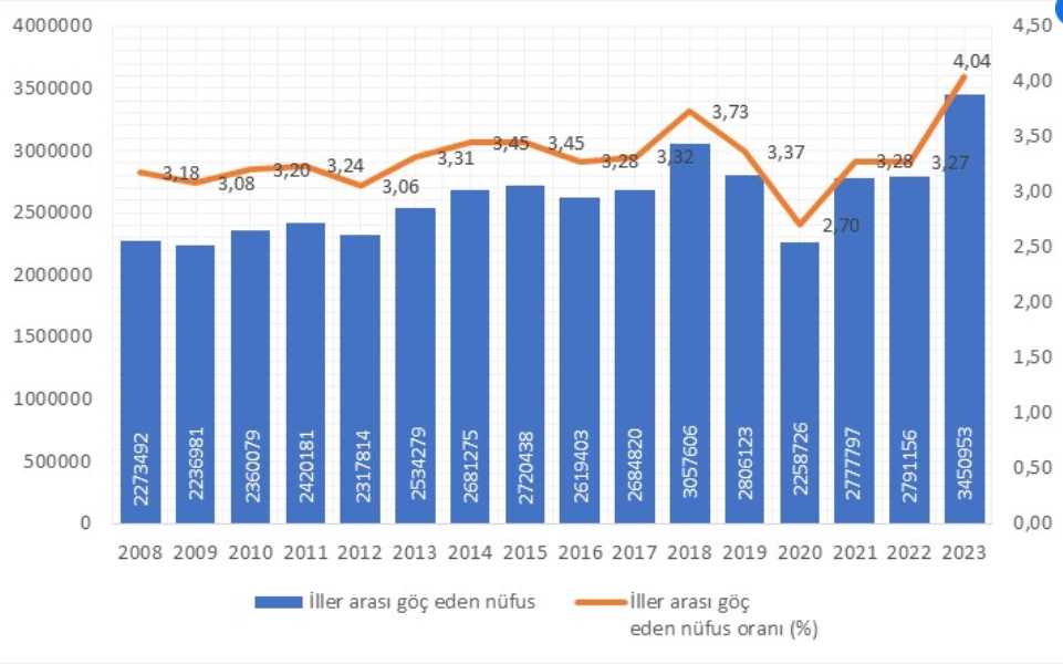 Bu oran, iller arası göçü yıllık olarak takip edebildiğimiz 2007 yılından beri görülen en yüksek oran.