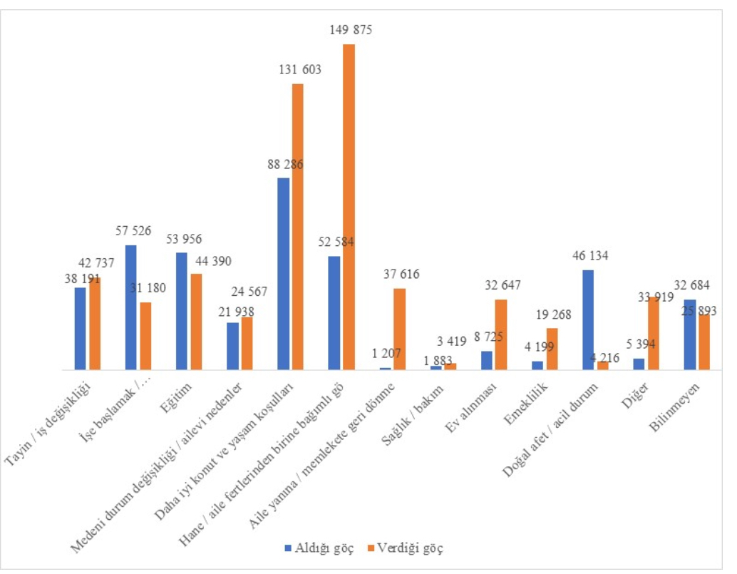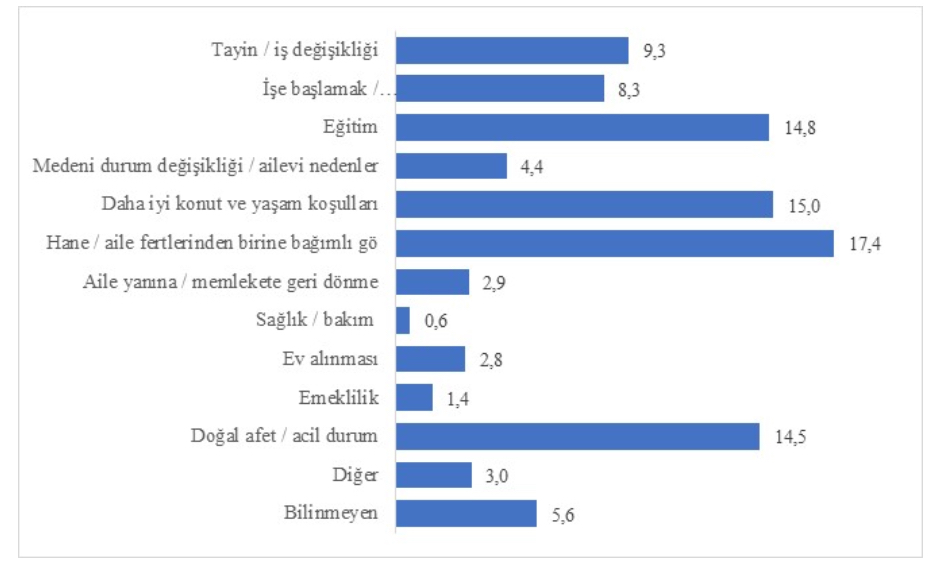 TÜİK 2018 yılından beri göç nedenlerini yayınlıyor. 2023 yılında gerçekleşen iller arası göçlerin yüzde 17,4’ü hane/aile fertlerinden birine bağımlı göç. Tabii göç istatistiklerinde tüm yaş grupları kapsandığı için özellikle çocuk yaştaki nüfus bağımlı göç kategorisinin ön plana çıkmasına yol açıyor. Göç edenlerin yüzde 15’i daha iyi konut ve yaşam koşulları için, yüzde 14,8’i eğitim nedeniyle göç etmiş durumda. Tayin/iş değişikliği ve işe başlamak/iş bulmak gibi işle ilgili nedenlerle göç edenlerin oranı toplamda yüzde 17,6. Medeni durum değişikliği, aile yanına, memlekete geri dönme, ev alınması, sağlık nedenleri oranları daha düşük göç nedenleri arasında.