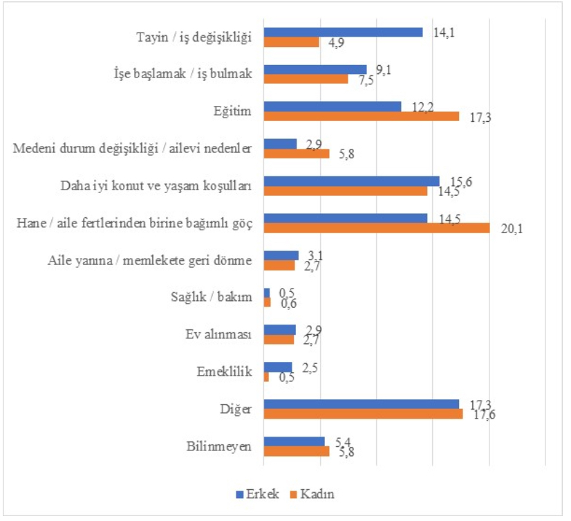 Dolayısı ile göç nedenlerini cinsiyete göre ayrı ayrı değerlendirmek gerek. Erkeklerin göç nedenleri arasında tayin, iş değişikliği, işe başlamak, iş bulmak gibi işle ilgili nedenler kadınlardan daha fazla iken kadınların göç nedenleri arasında hane/aile fertlerinden birine bağımlı göç ve medeni durum değişikliği gibi nedenler erkeklerden daha yüksek oranda. Bu nedenle kadın göçü bağımlı göç olarak niteleniyor.