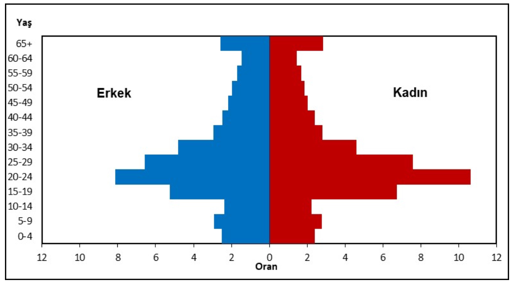 Göçmenlerin nüfus piramidine bakıldığında Türkiye genelindekinden oldukça farklı olduğu görülüyor. Ortası şişkin bir yapıya sahip olan göçmen nüfus piramidinde göçün yoğun olarak 15-34 yaşlarında gerçekleştiği de kadınların payının daha çok olduğu da net bir şekilde görülebiliyor.