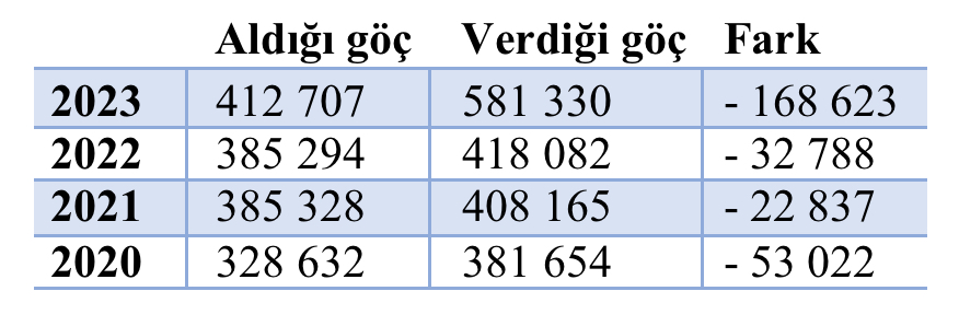 Tablo 1. İstanbul’un aldığı ve verdiği göç, 2020-2023