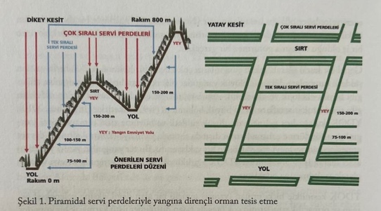 Şekil 1 ve 2’de ayrıntılarıyla görüldüğü gibi, bir ya da birkaç sıradan oluşan servi perdeleri sırtlarda, eş yükseklik eğrilerine paralel şekilde belirli aralıklarla yinelendiklerinde, rüzgar ve alevlere karşı engelleme yaparak ormanın yangın direncini önemli ölçüde artırabilirler.