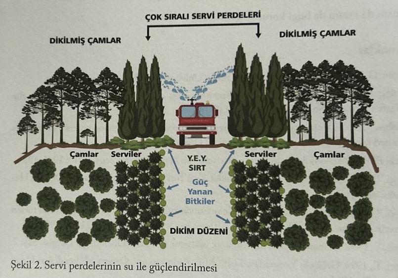 Bir başka önemli katkı, yangın henüz bu servi sıralarını etkisi altına almadan helikopter ve uçaklardan atılacak sularla bu perdelerin yanma direncinin önemli ölçüde artırılabilmesidir (şekil 2).