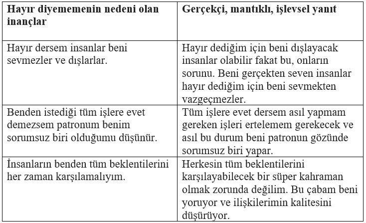 Hayır demeyi kolaylaştıracak bir diğer yöntem de neden hayır diyemediğimizi anlamak ve bu nedenin altında yatan inançlarımızı gözden geçirmektir. Bu inançları gözden geçirip daha gerçekçi, mantıklı ve işlevsel inançlar geliştirebiliriz. Aşağıdaki tablo bununla ilgili örnekleri içeriyor.