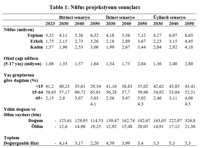 Birinci senaryo, Birleşmiş Milletler’in nüfus projeksiyonlarına göre Kuzey Afrika ve Batı Asya bölgesinde 2050 yılı için öngörülen 2.2 çocuk varsayımına dayanıyor.