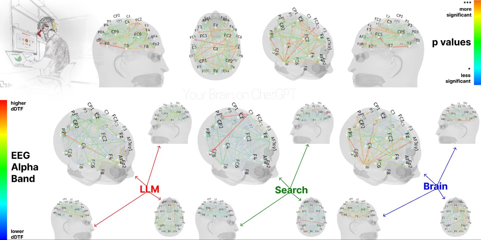 Daha basit bir ifadeyle, LLM’lere ve daha az ölçüde arama motorlarına güvenmek, görevle ilgili beyin bağlantısını önemli ölçüde azaltır ve bu da kompozisyon yazma görevi sırasında bilişsel katılımın daha düşük olduğunu gösterir.